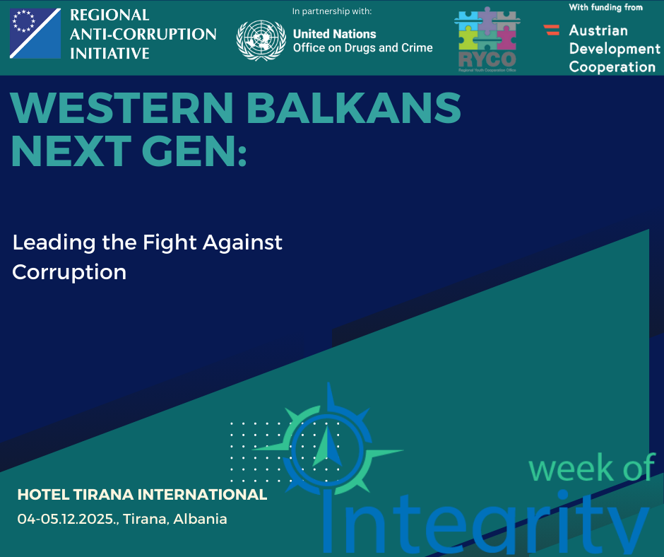 Western Balkans Next Gen: Leading the Fight Against Corruption Share on FacebookTweetFollow us + Add to Google Calendar + iCal / Outlook export 00 days 00 hours 00 minutes 00 seconds Date Dec 05 2025 Time 09:00 - 16:30 Location Tirana International Hotel Skanderbeg Square, City center Category Workshop Organizer RAI - Regional Anti-corruption initiative Share this event